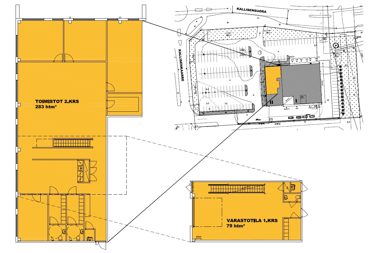 Vuokrattavana toisen kerroksen toimistotilaa 280 m2 sekä katutasosta varastotilaa 79 m2, tilojen välillä on portaikko, mikä yhdistää tilat toisiinsa. Tilat ovat uudehkot, teknisesti hyvässä kunnossa ja sopii monenlaiseen liiketoimintaan.