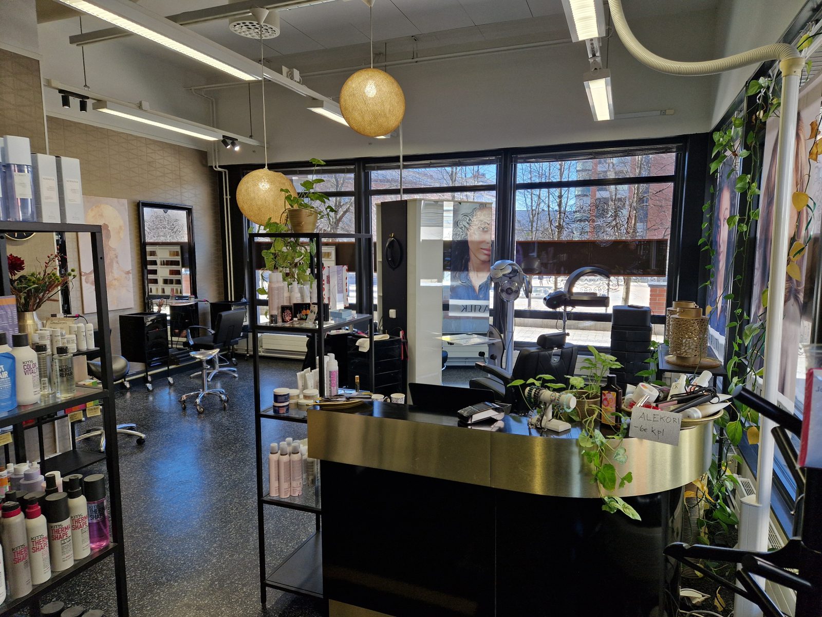 | Tila 1. kuvaus | Valoisa, korkea tila (huone + minikeittiö ja wc) vilkkaalla paikalla. Toiminut parturi-kampaamona, mutta sopii monenlaiseen käyttöön. Tila on ensisijaisesti vuokrattavana joko tyhjänä tai parturi-kampaamovarustein. Parturi-kampaamona tilassa on neljä asiakas- ja kaksi pesupaikkaa. Erittäin hyvin muokkautuva tila on myös mahdollista ostaa. |
